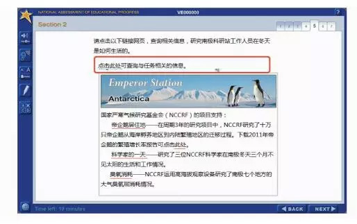 嵌入任务情境之中的试题有选择题和简答题两大类型,题数一般是10-15个,都是新情境的问题解决,在题干部分会有一些超链接为学生提供有关任务的提示和信息,学生可以运用ICT查询、分析相关信息解答问题。例如要求学生研究南极科研站工作人员的冬天生活,课件提供的超链接文本有关于南极帝企鹅、南极站科学家的生活状况,以及南极大气层特点等等。学生阅读分析这些文本之后,逐一回答相关的选择题或简答题。