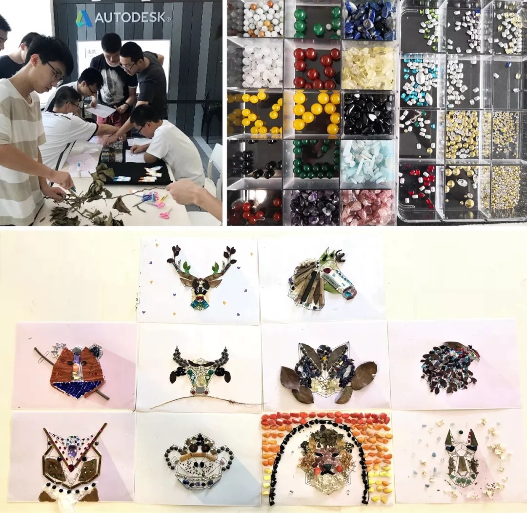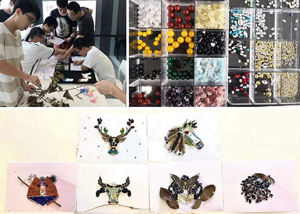 研究首饰的基本分类、加工过程分类、奢华品牌,同学们在抽象动物画板上,制定风格,并采集不同珠宝、身边的可回收材料进行装饰画搭建。了解什么是首饰设计,感受布局、色彩的重要性。