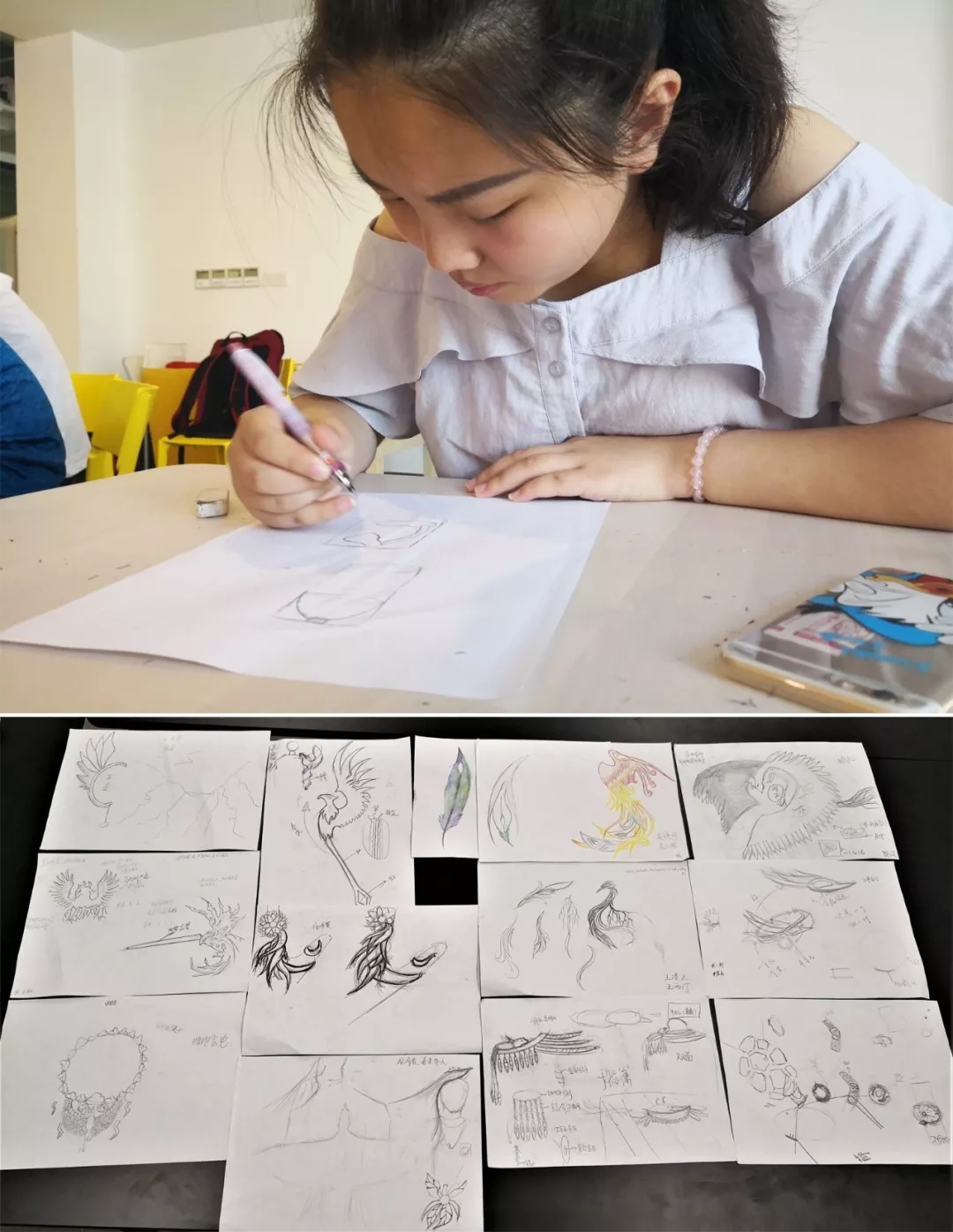 本次首饰设计要求结合“雷·凤凰”元素,以故事的形式描述设计初衷。既定设计方向后,同学们用画笔将想法由生动的故事转化为形象的设计方案。